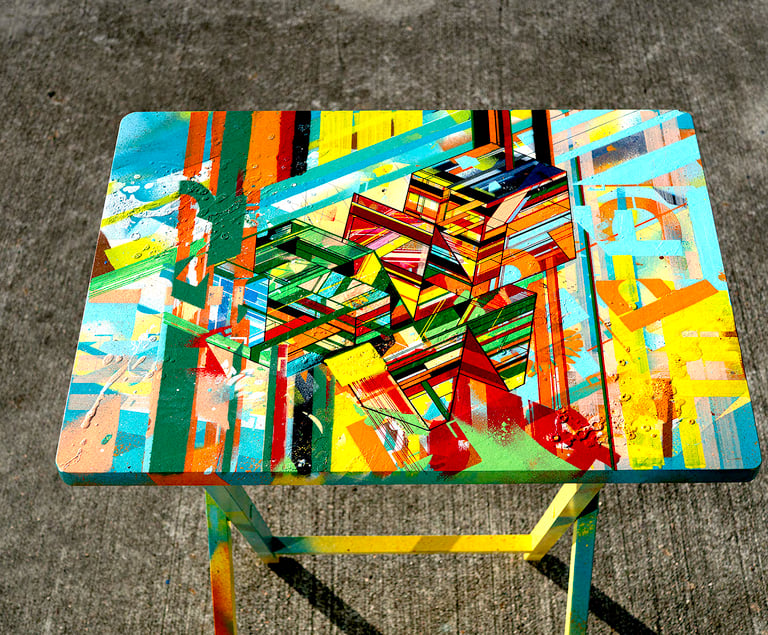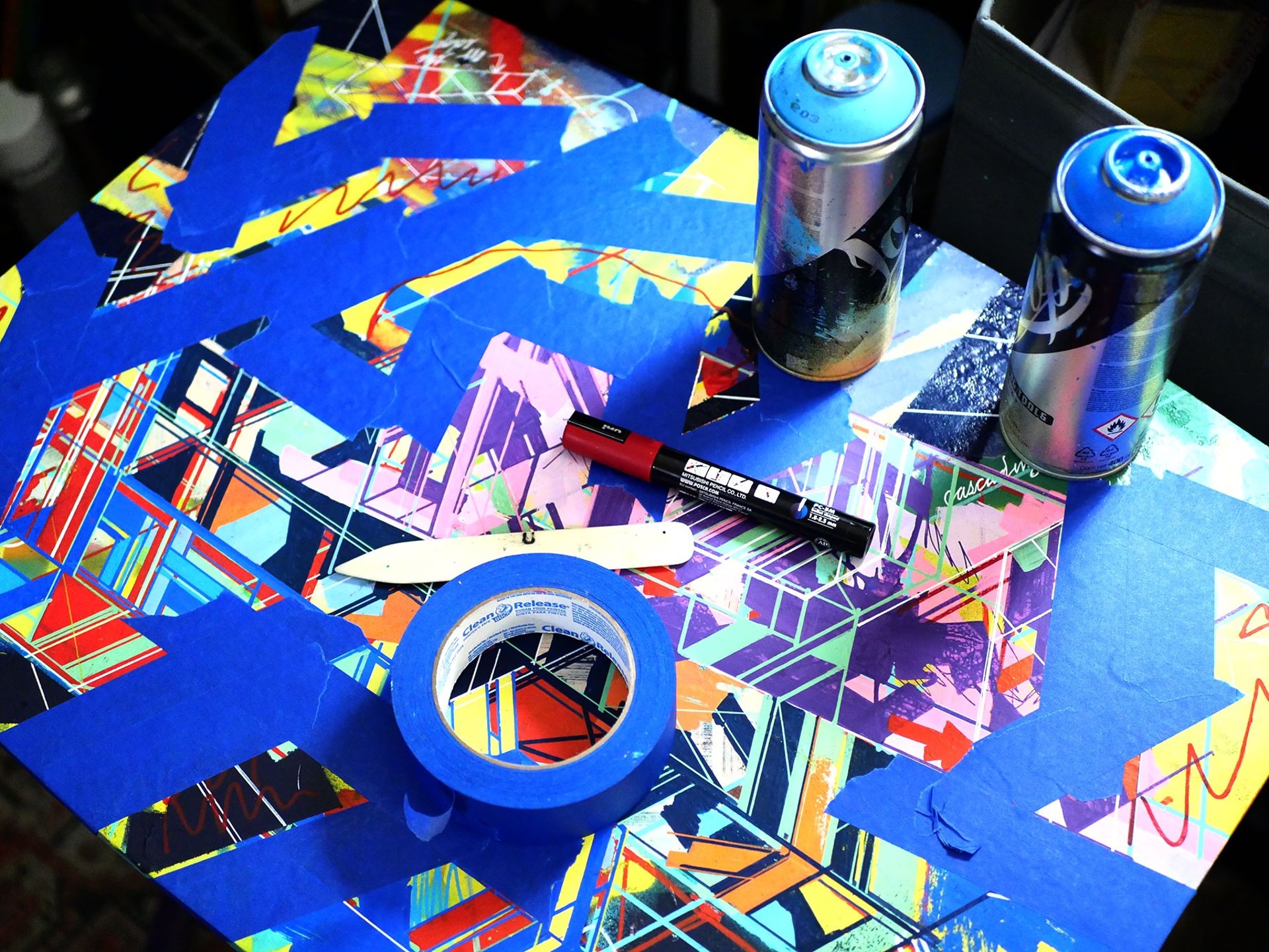 Looking at my artistic journey, it’s like I’m constantly balancing two sides: the structured world of geometric design and the vibrant, free-flowing realm of aerosol painting. This ongoing exploration is shown through the way I spray and shape paint with different tools. Lately, I’ve been experimenting with mixing these two styles, but it’s not quite the same as before.