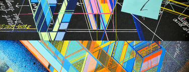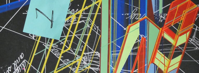 Drawing inspiration from architectural principles and geometric abstraction. I employ pre-composed images and spontaneous painterly strokes in the creation of all my free-association works.